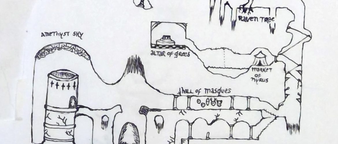 A heavy wooden door separates the Market of Nyrus from Ram-Govog’s Descent. This chamber is filled with colorful tents and market stalls, where a single goblin named Nyrus is the sole proprietor of every shop. Characters showing interest in another shop have to wait for Nyrus to finish his current business, hop down from his stool, hustle over to the next shop, and climb the next stool. Sometimes he stops to change clothes to suit the persona of the next shopkeeper; he also usually changes to a new, atrocious accent.